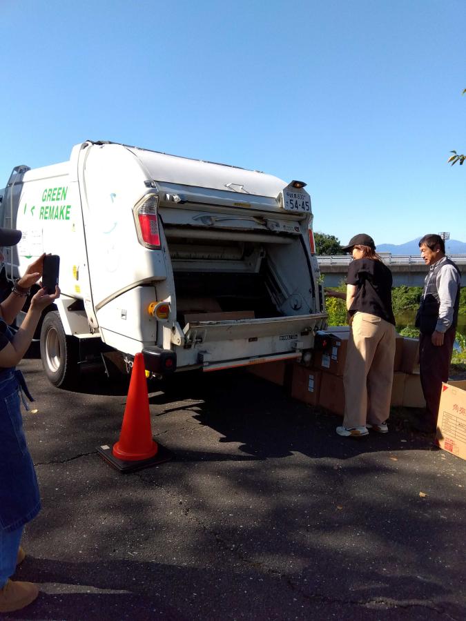 資源物のお持込、パッカー車による段ボールの積込体験に
