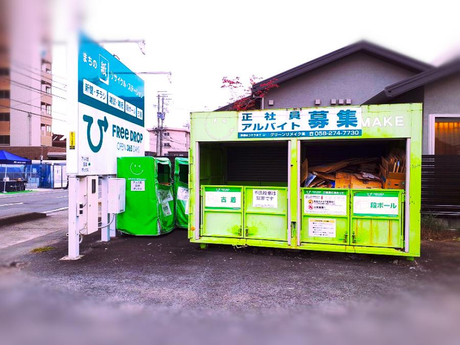 FREE DROP市橋 アルミ回収ボックスを新たに設置しました! お近くにお住まいの方、事業所様等、是非ご利用下さいませ! 今まで通り、段ボール・新聞・雑誌・古着も受入無料です。 所在地:岐阜市今嶺3丁目12−14