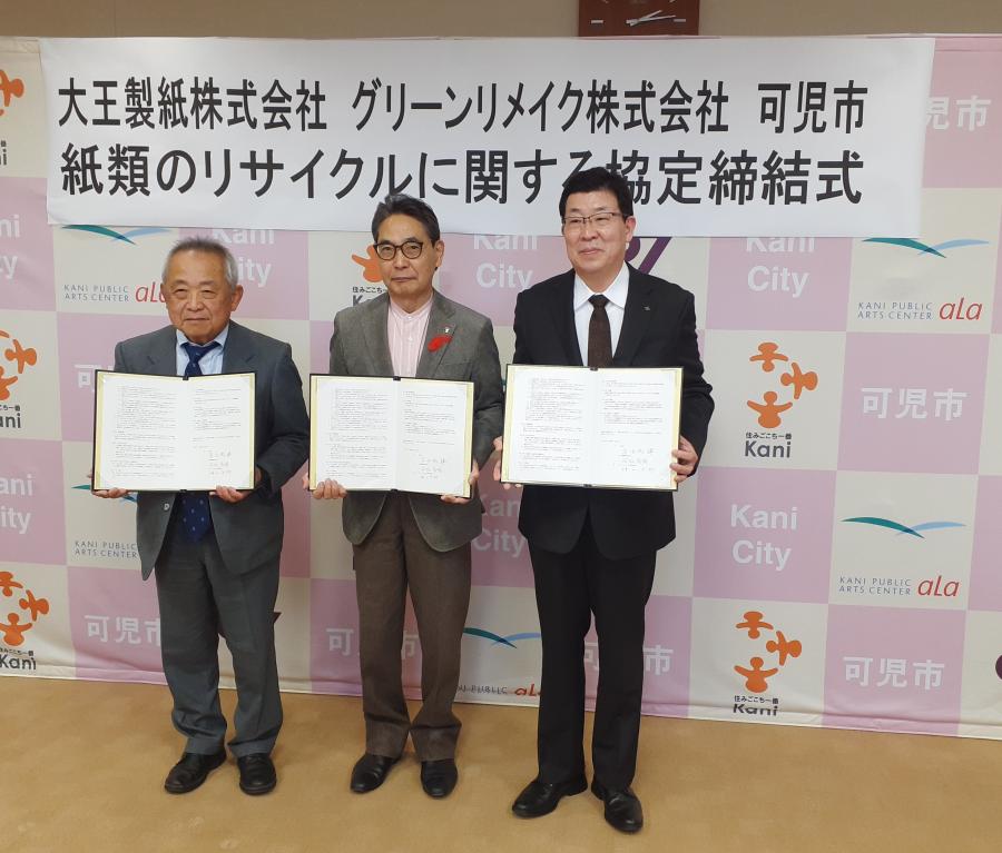 12月22日、可児市様、大王製紙様と 紙類のリサイクルに関する協定を締結しました。 12月24日、中日新聞、岐阜新聞に掲載していただきました。 可児市エコドームで日曜日に回収された古紙を 弊社が収集運搬し、選別、破砕、圧縮梱包してから 大王製紙様がリサイクル製品を製造、販売します。 大王製紙様とは来年度から小中学校の環境学習への 職員派遣にも協力します。